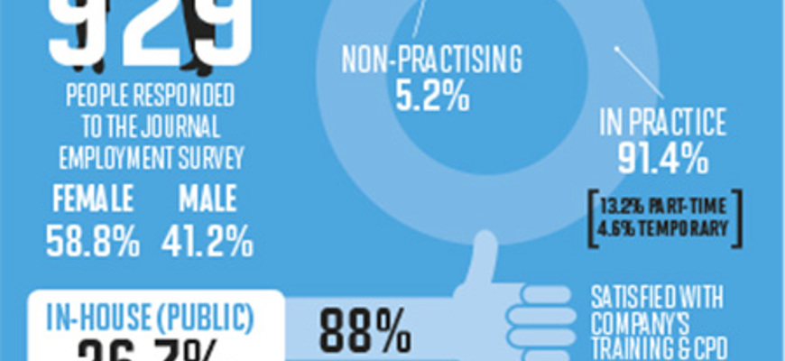 Thank you to the 929 people who responded to this year's Journal employment survey, somewhat more than last year, though the breakdown by gender (58.8% female; 41.2% male) happened to be exactly the same. In-house lawyers, at 26.7% from the public sector and 15.1% from the private sector, were somewhat overrepresented compared with the profession as a whole, but the figures enable some useful comparisons to be drawn. In all, 91.4% of respondents were in practice, 5.2% non-practising, and 3.4% not currently in employment. Of those employed, 13.2% were part time, and 4.6% (not necessarily from the same group) on temporary contracts.