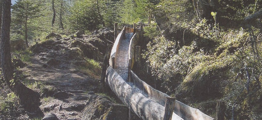 The Bovet Lade (“le Bief Bovet”) runs for several kilometres across a hillside in Haute Savoie, descending from 1,830 metres above sea level through the forests of Aime and Longefoy. At some points closely resembling a natural mountain stream, at others clearly a manmade watercourse (see image), it was built both to serve local mills and to provide a water supply to the population.