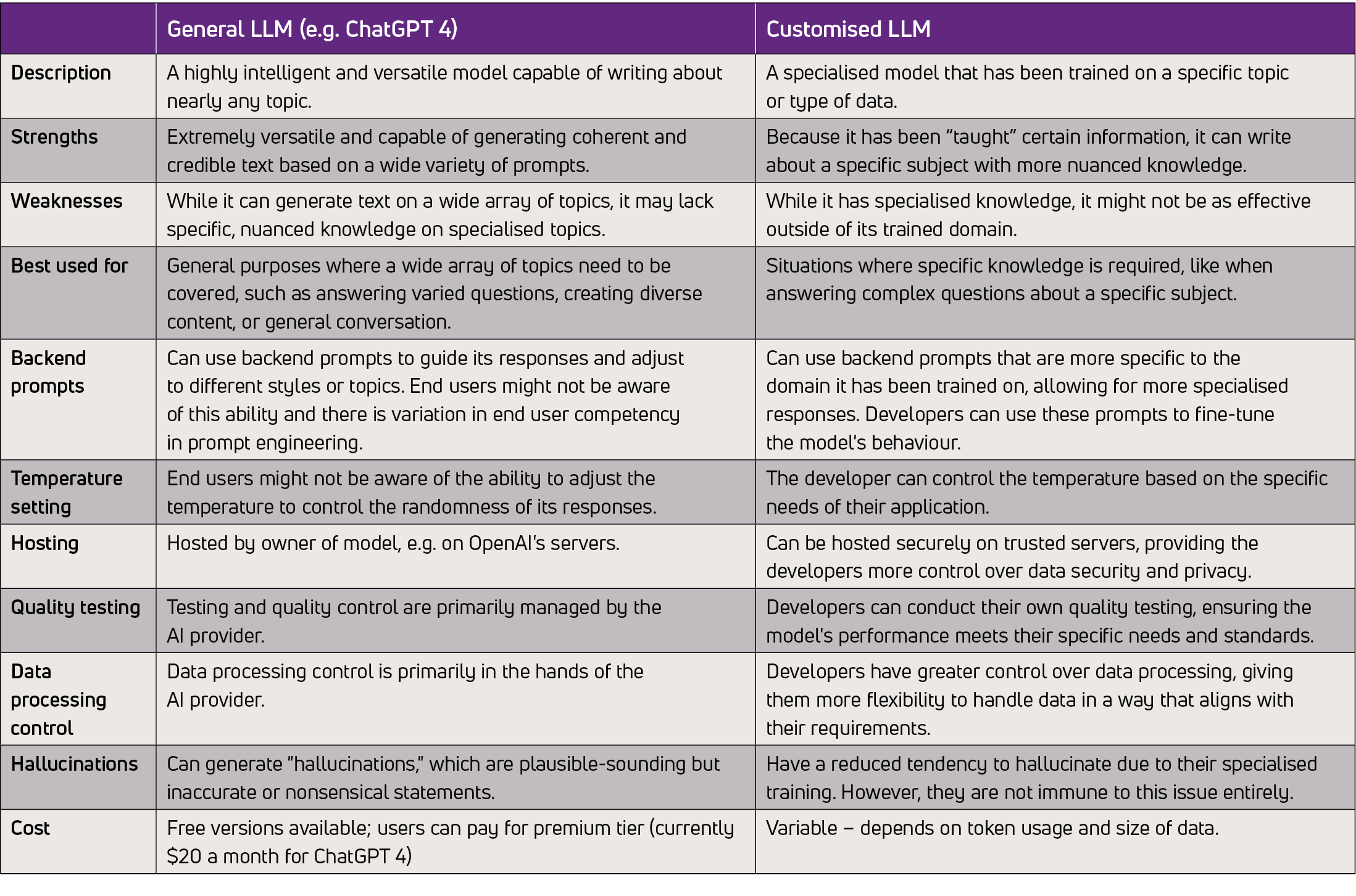The contrast between the use of general LLMs such as ChatGPT 4 and a customised version using an API such as OpenAI’s gpt-4 can be seen in the table below.